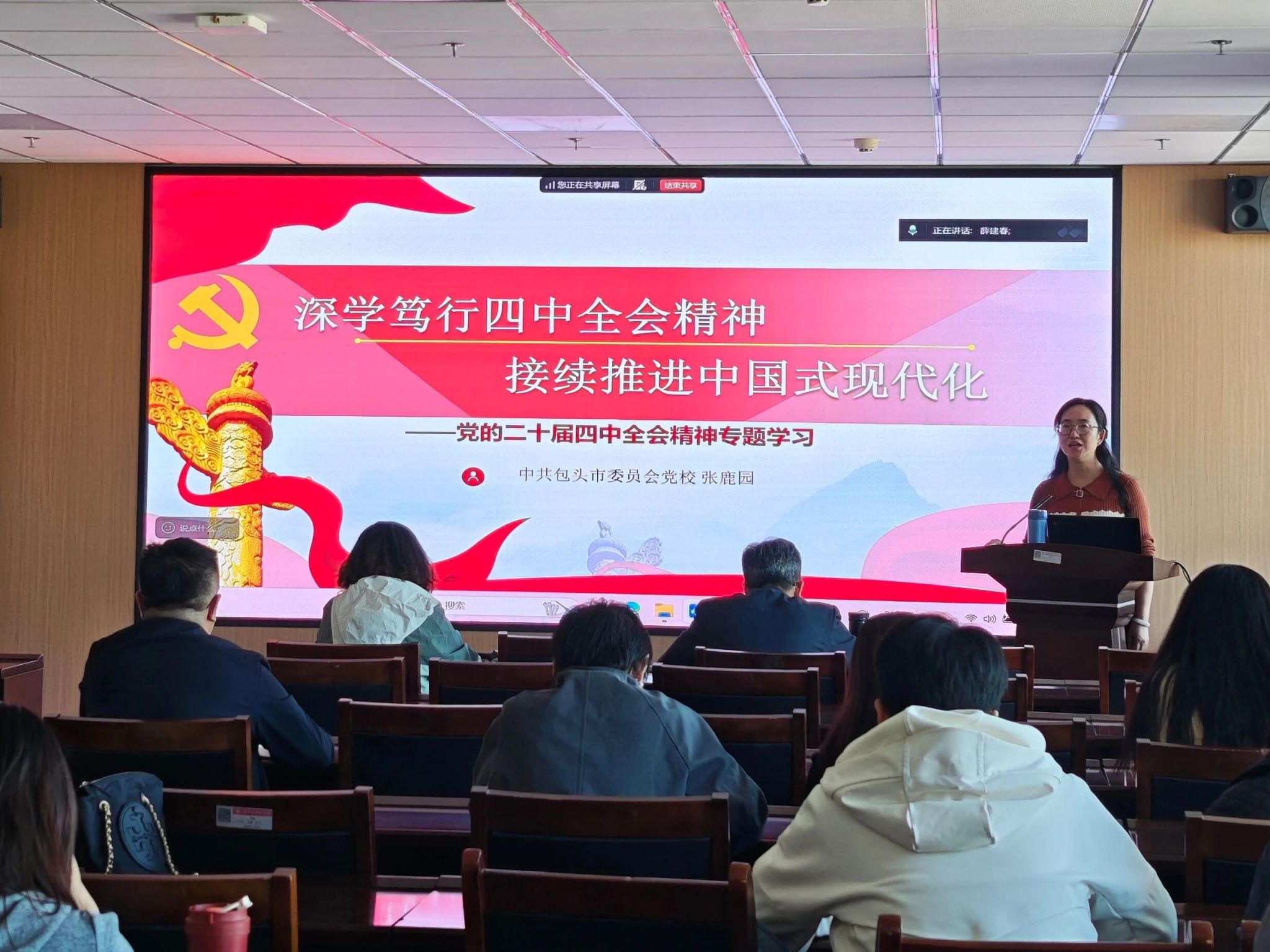 为深入领会、精准把握党的二十届四中全会精神实质与丰富内涵,切实把思想和行动统一到党中央决策部署上来,2025年11月13日,文法学院党委组织召开了学习贯彻党的二十届四中全会精神专题培训学习活动。会议特邀中共包头市委员会党校张鹿园老师作专题授课,学院党委副书记(主持工作)薛建春主持会议,学院全体教职工及学生党员参加学习。