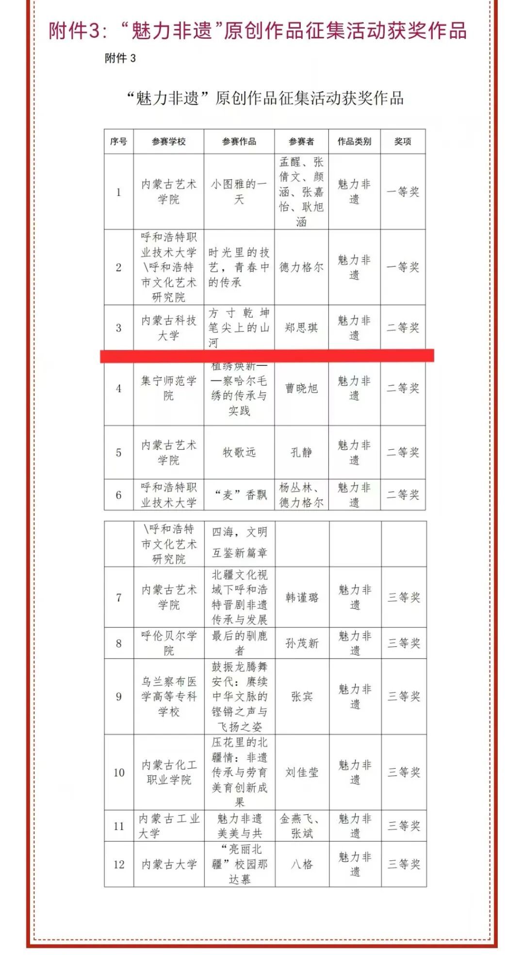 近日,自治区教育厅公布2025年全区高校“礼敬中华优秀传统文化”宣传教育活动评选结果。我院由王晓敏老师指导,郑思琪、张文泽、刘蕾、李欣然、康姝婷、张博雅、翟鲁凯等同学报送的非遗主题原创作品《方寸乾坤·笔尖上的山河》凭借独特文化视角与精良制作,从全区众多参赛作品中脱颖而出,荣获“魅力非遗”原创作品“二等奖”。