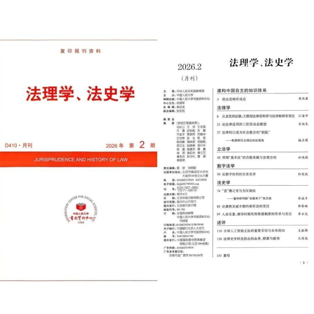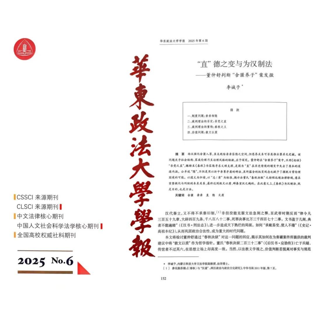 近日,我院法学系李诚予副教授的学术论文《“直”德之变与为汉制法——董仲舒判断“舍匿养子”案发微》获中国人民大学复印报刊资料《法理学、法史学》2026年第2期全文转载。该论文原刊发于《华东政法大学学报》2025年第6期。
