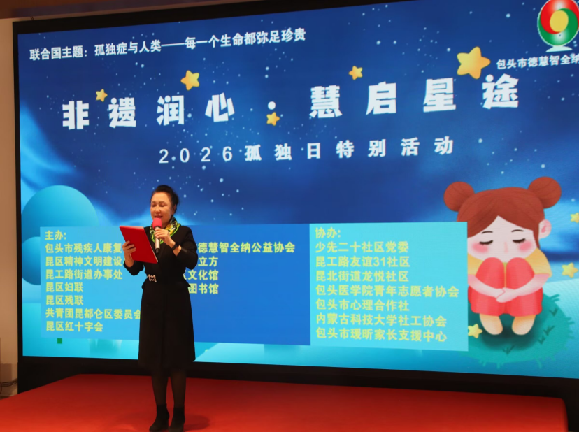 2026年3月28日下午,“非遗润心·融爱伴星”2026年世界孤独症日(4月2日)关爱公益活动在包头鹿城阅立方顺利开展。活动以关爱孤独症群体为核心,通过文艺展演、爱心捐赠等形式,传递社会温暖,包头市残疾人康复中心、昆区精神文明建设办公室、昆区妇联等主办,包头市德慧智全纳公益协会、鹿城阅立方等承办,少先二十社区党委与内蒙古科技大学社工协会等协办,保障活动有序推进。世界孤独症日的核心意义是让孤独症群体被看见、被尊重、被支持,此次活动旨在强调关爱孤独症群体的社会意义,呼吁各界携手传递爱心。