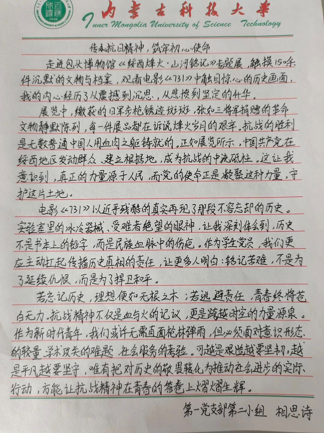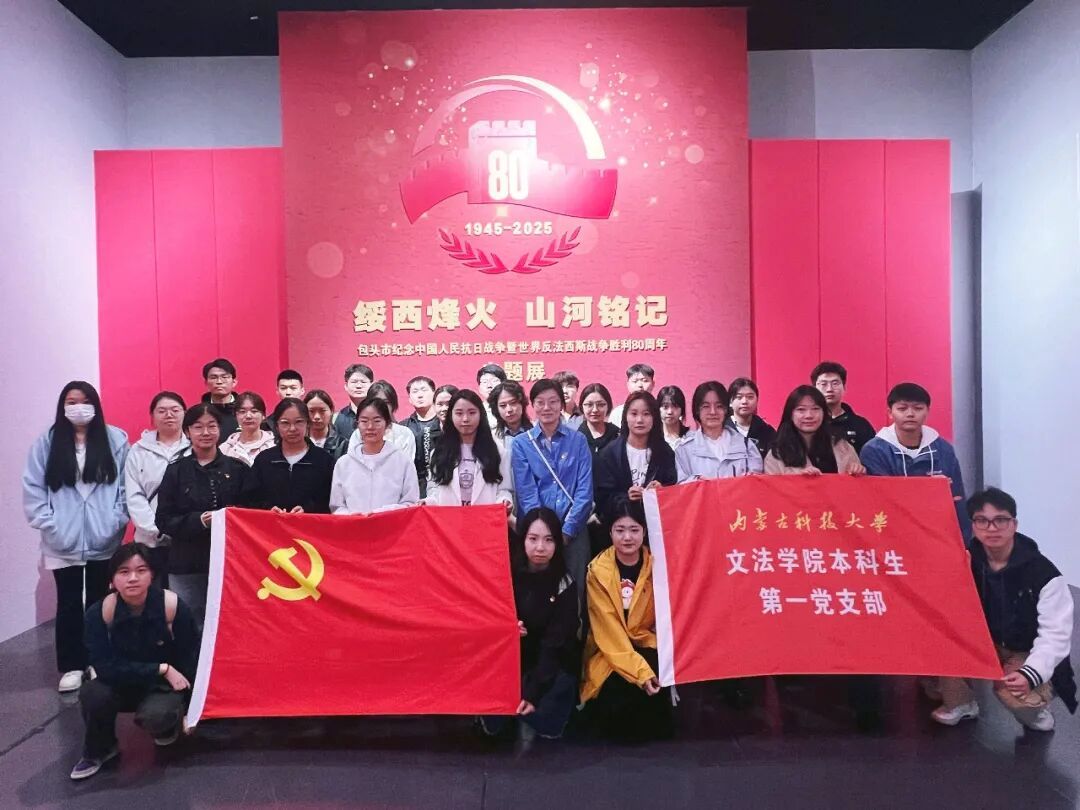 为纪念中国人民抗日战争暨世界反法西斯战争胜利80周年,深刻缅怀革命先烈,传承伟大抗日精神,文法学院本科生第一党支部于2025年9月28日组织开展了以“传承抗日精神,筑牢初心使命”为主题的党日活动。支部成员集体参观包头博物馆“绥西烽火·山河铭记”专题展,并观看重大历史题材影片《731》。