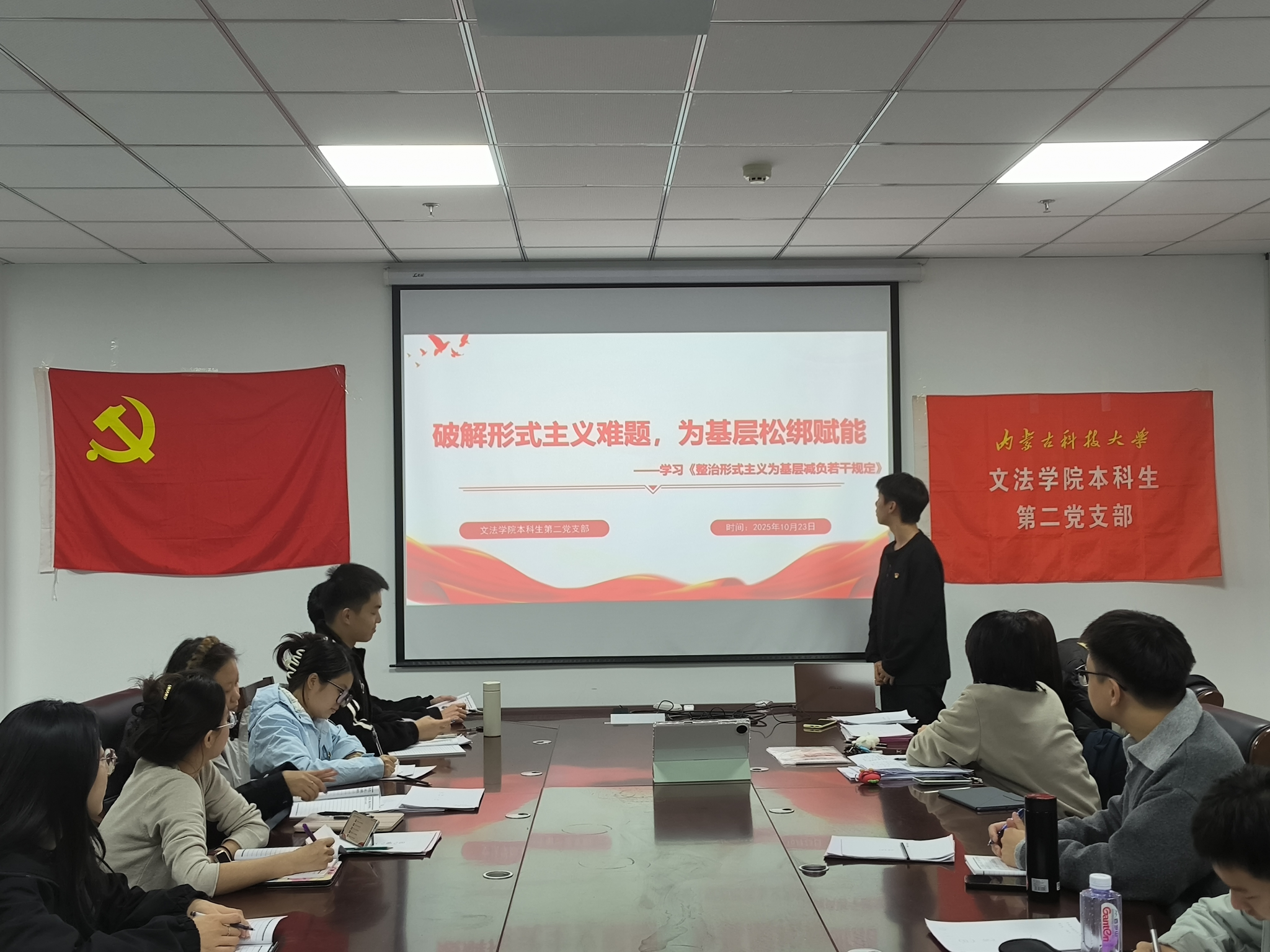 2025年10月23日晚18:30,文法学院本科生第二党支部在文华楼B1503召开党员大会,学习《整治形式主义为基层减负若干规定》,此次学习旨在加强作风建设,进一步增强党员遵规守纪的自觉性和坚定性。