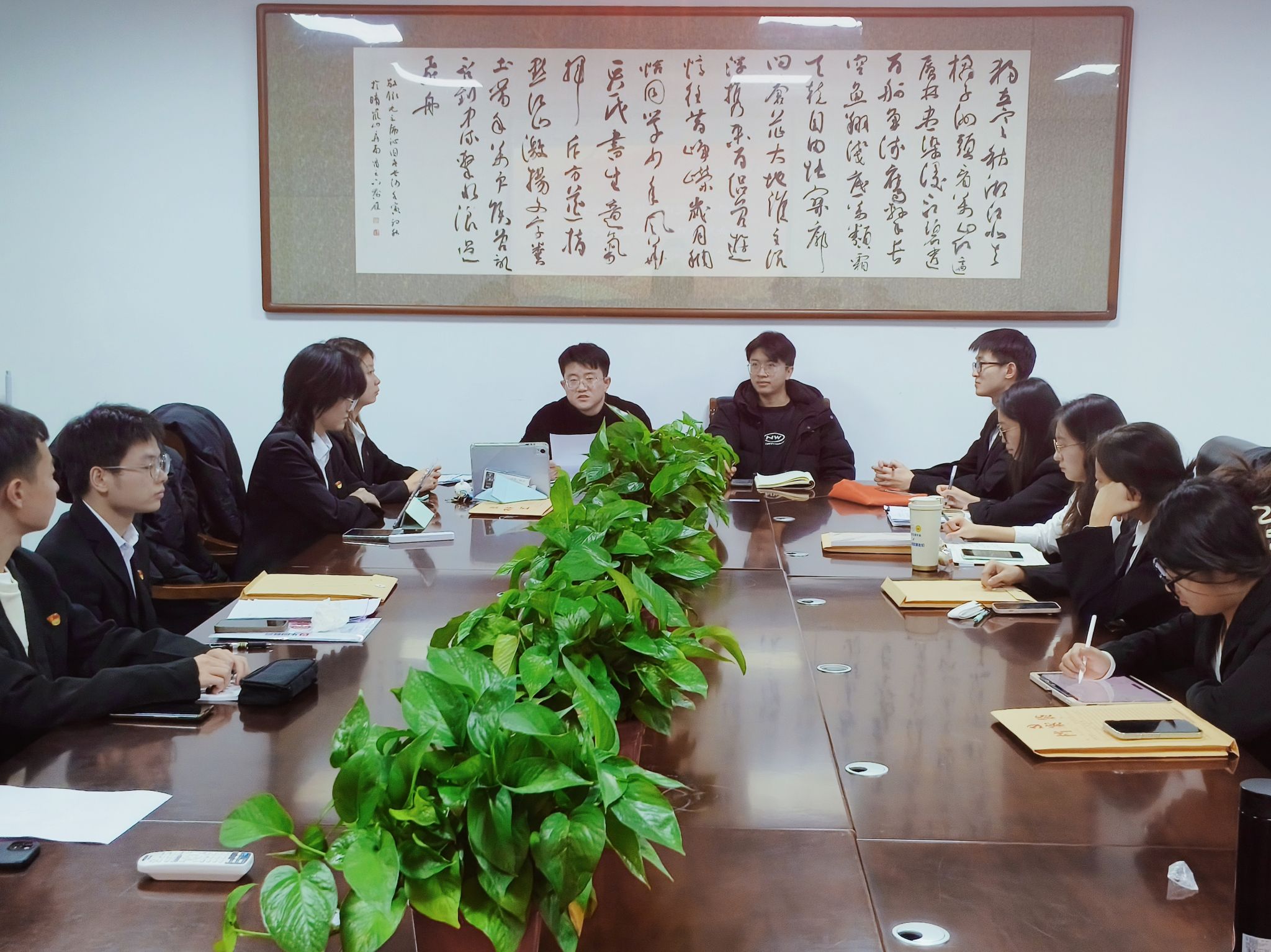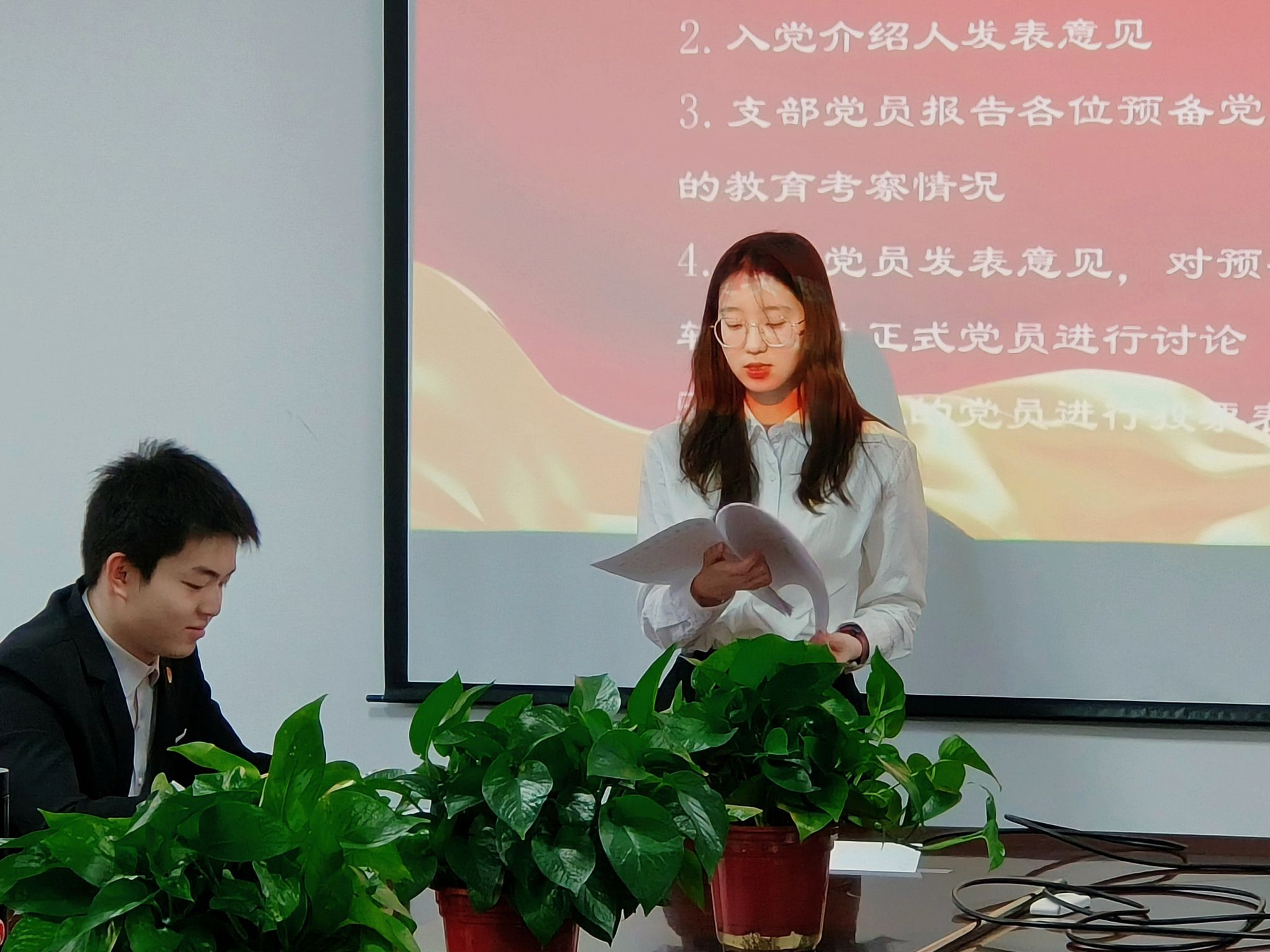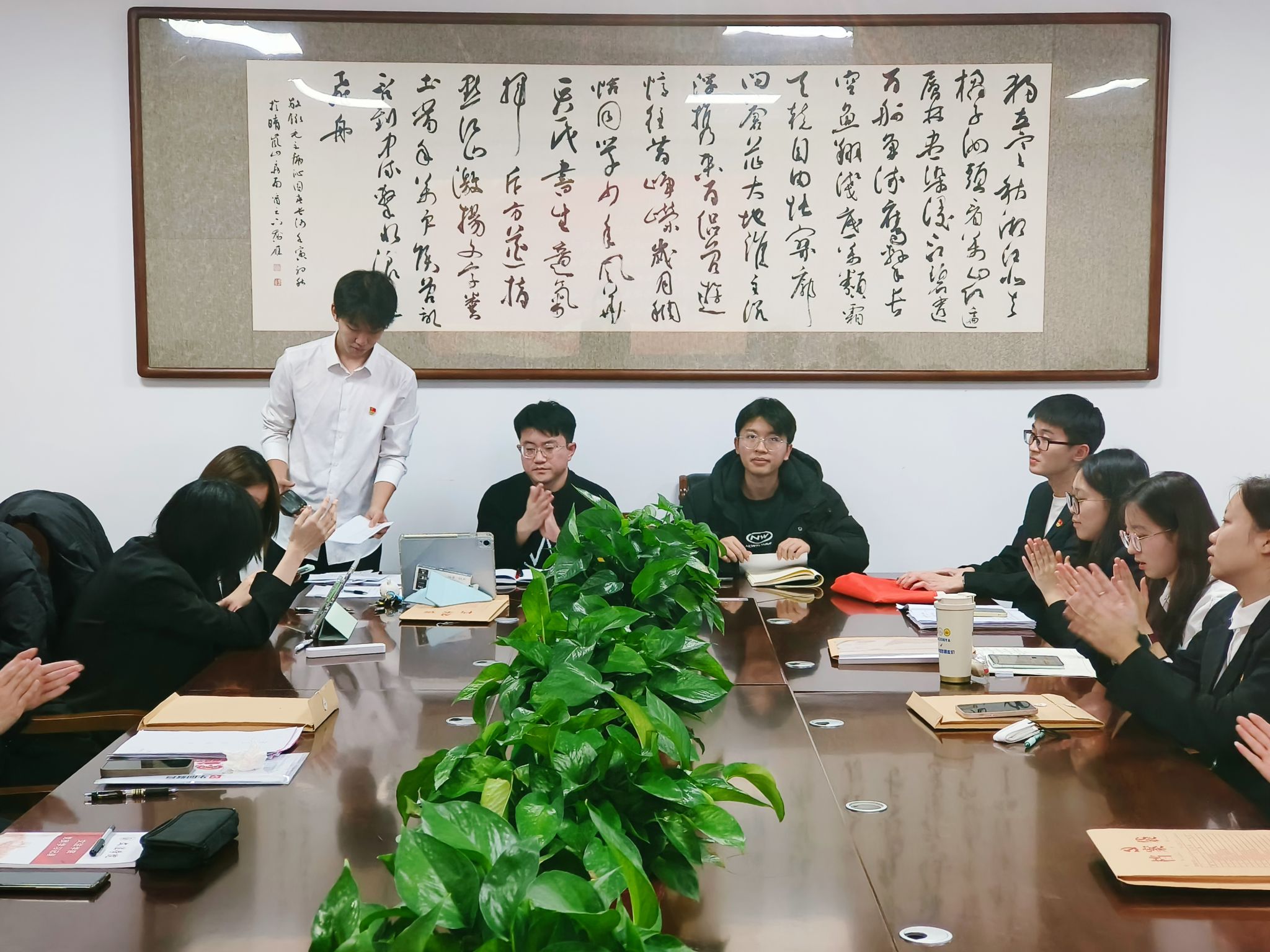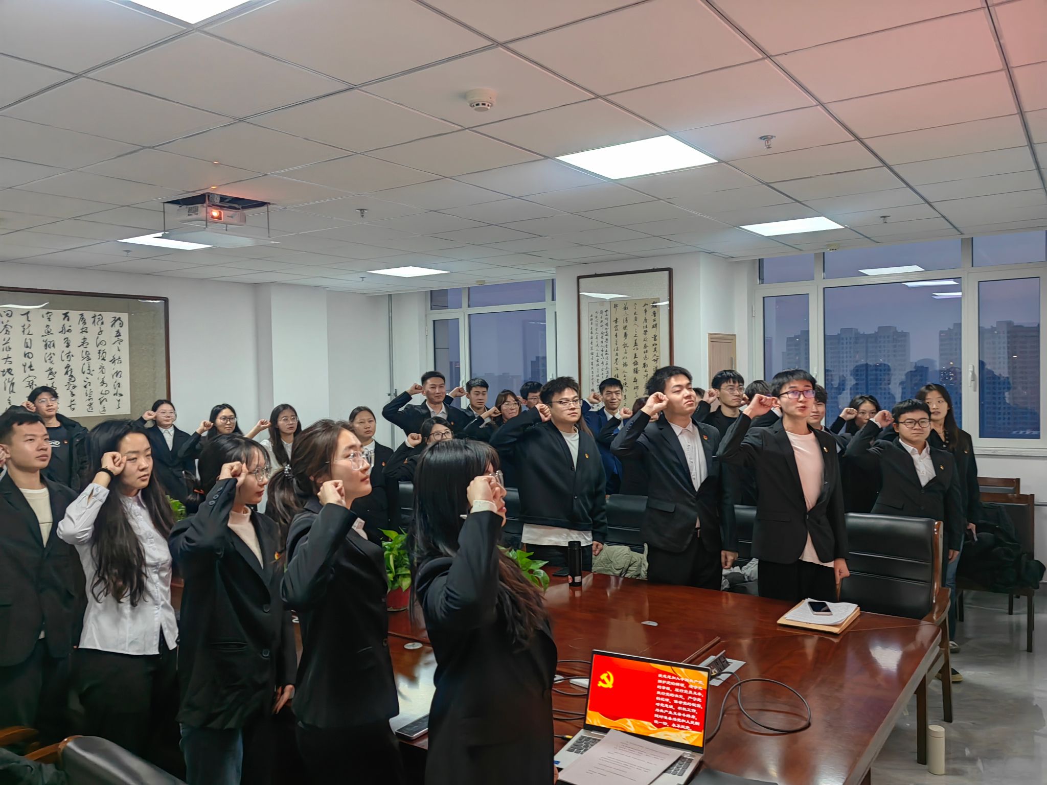2025年12月15日下午16:30,文法学院本科生第二党支部于文华楼B1503召开党员大会,讨论预备党员转正事宜并举行新发展预备党员入党宣誓仪式。