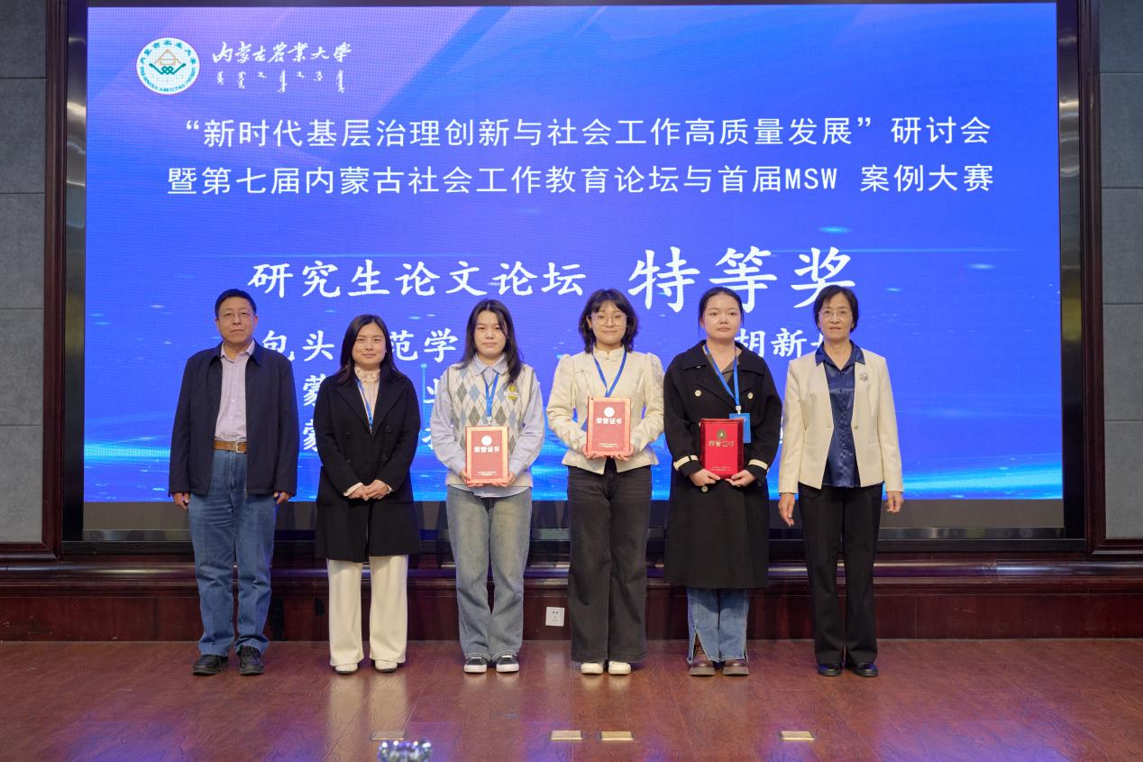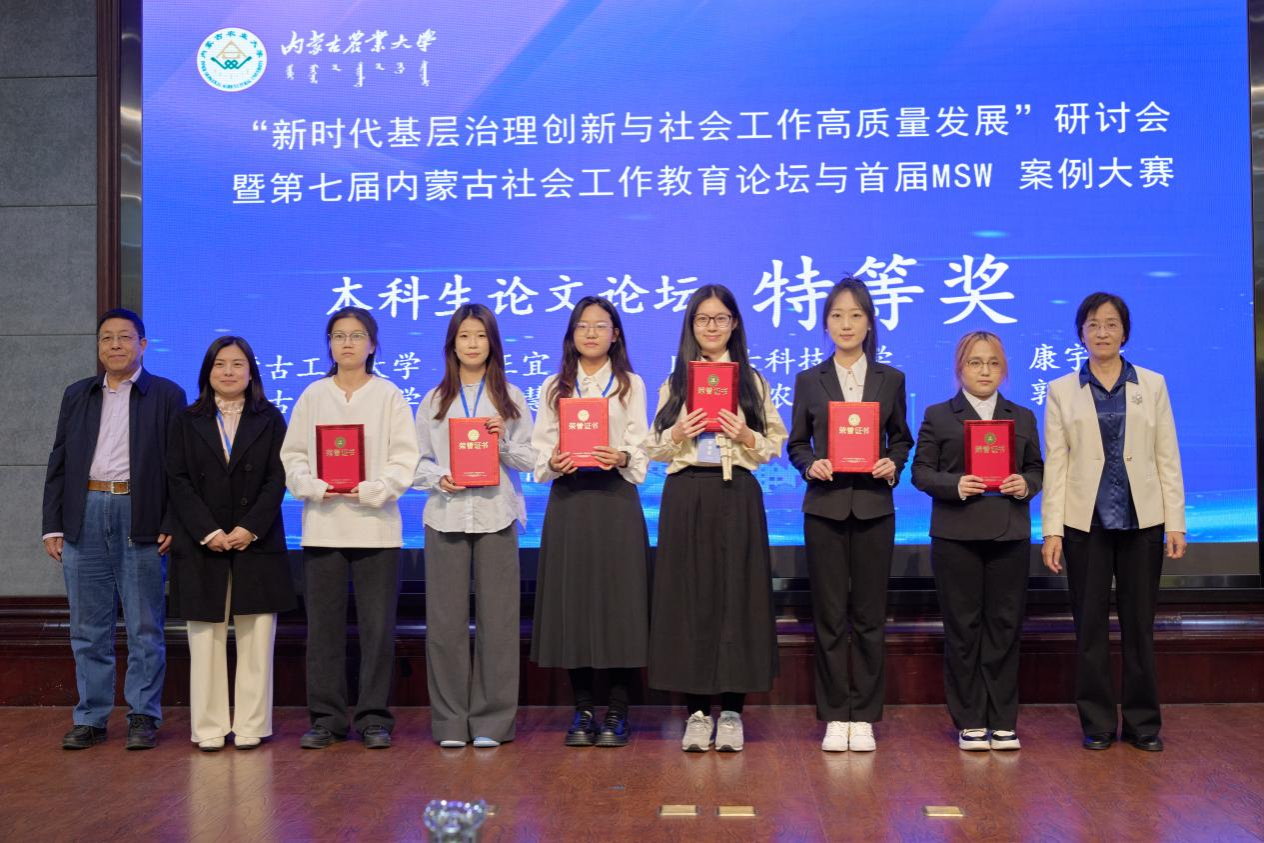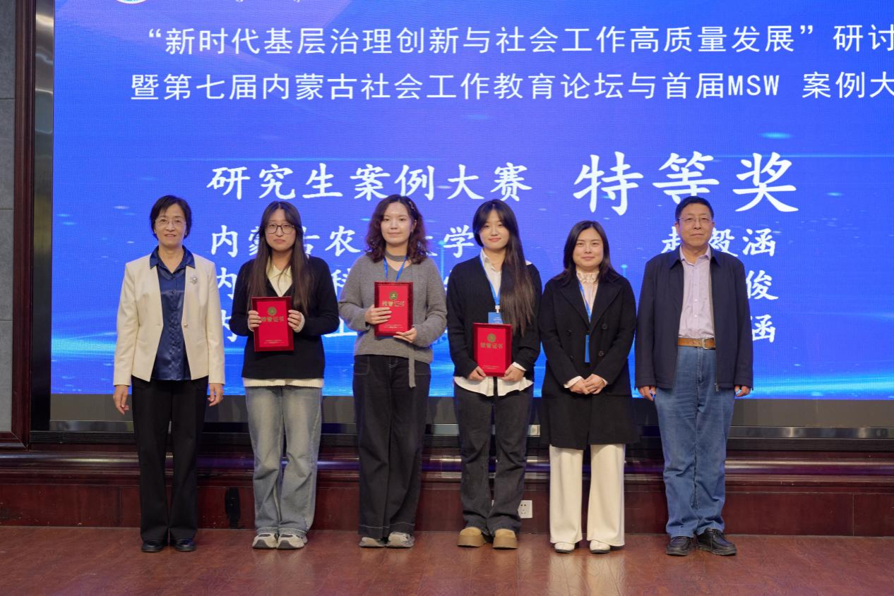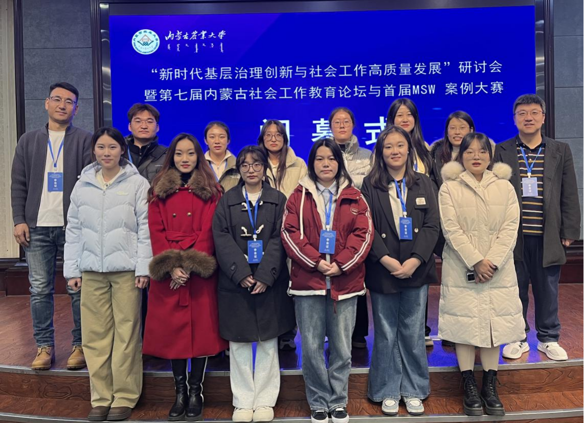 2025年11月21日,由内蒙古社会工作协会、内蒙古社会工作高校联盟主办,内蒙古农业大学人文社会科学学院承办,美亚联创(北京)科技有限公司协办的“新时代基层治理创新与社会工作高质量发展”研讨会暨第七届内蒙古社会工作教育论坛与首届MSW案例大赛在呼和浩特市隆重召开。全区9所设有社会工作专业高校的近百名专家学者和学生齐聚青城。我校文法学院社会工作系侯荣庭副教授、张瑞博士、哈那嘎尔博士、程晨博士与12名社会工作专业学生组成代表队应邀参会,师生团队在学术交流与赛事评选中均表现突出,一举夺得10项大奖,包括特等奖3项、一等奖4项、二等奖3项,实现成绩与影响力的双丰收,充分彰显了我校社会工作专业人才的雄厚实力与培养质量。